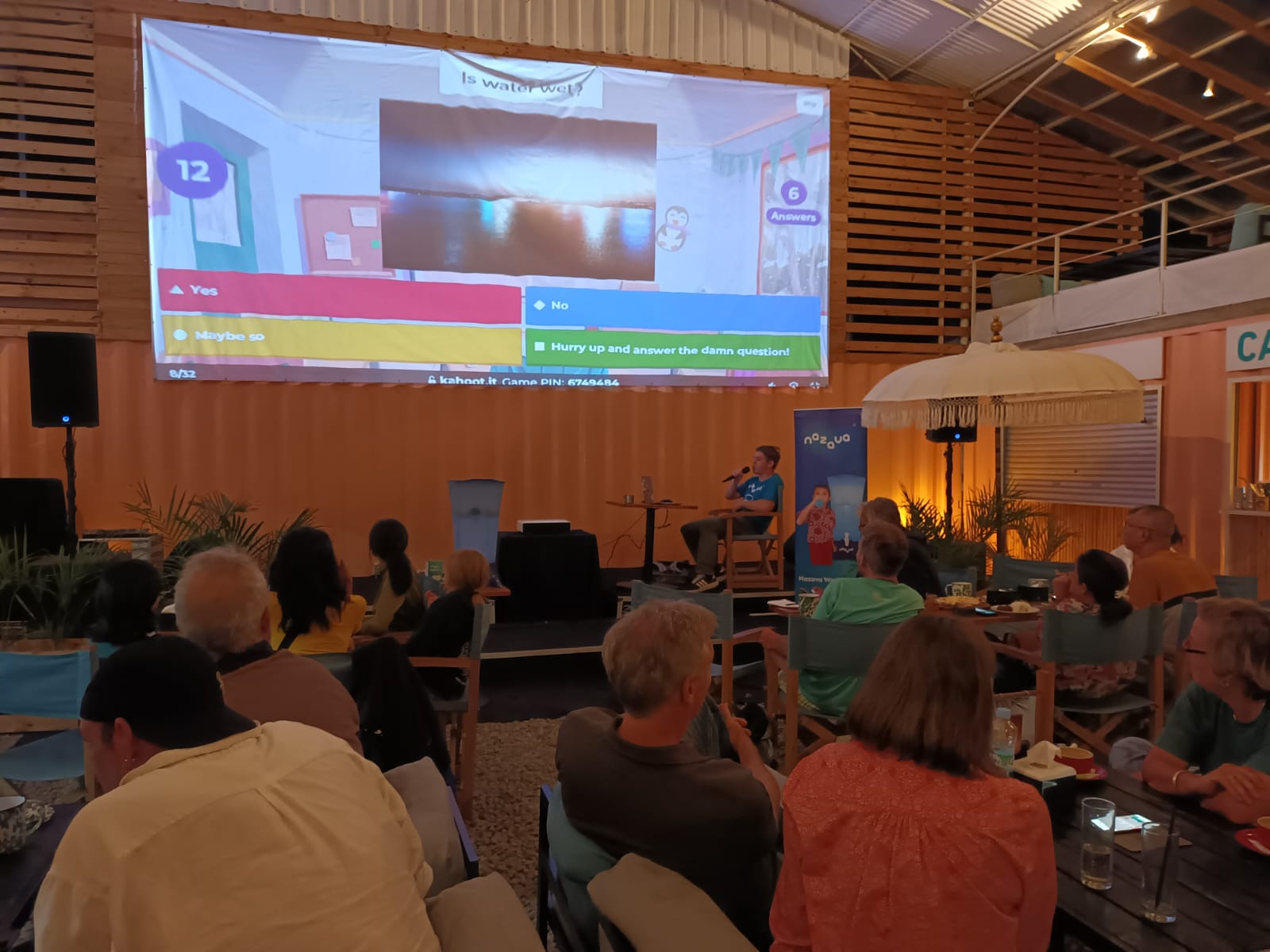 Setiap bulannya, Tambuhak Cafe mengadakan quiz night. Di bulan Maret,mereka mengangkat tema mengenai air karena adanya hari air sedunia. Tentu saja, hal ini berkaitan erat dengan Nazava. Acara yang berlangsung selama tiga jam lamanya. Quiz menggunakan pertanyaan seputar pengetahuan tentang air. Ada tiga babak dalam permainan ini. Aplikasi yang digunakan dalam quiz ini adalah Kahoot.